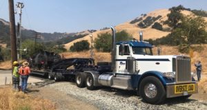 On Wednesday, a truck delivered the frame and running gear for Southern Pacific 2-6-0 No. 1744 to the Pacific Locomotive Association. The 1901 Baldwin will be rebuilt for operation on the association’s Niles Canyon Railway.