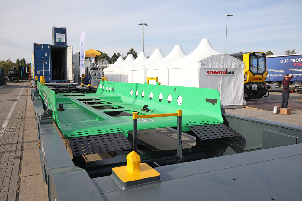 While passenger equipment often dominates InnoTrans media coverage, there are far more freight cars and maintenance-of-way vehicles on display, from a wider variety of manufacturers. Slovak freight car manufacturer Tatravagónka Poprad exhibited newly designed intermodal wagons designed to accommodate truck semi-trailers that are craned onboard in specially designed trays; this allows rail movement of lighter-weight trailers that otherwise cannot be craned, as they simply cannot take the stresses involved, and offers an option at freight terminals where space is limited. Many of the freight cars displayed featured the new European digital couplers fitted; while agreement has been reached on technical standards for these, there remains uncertainty about financing implementation of the new system.