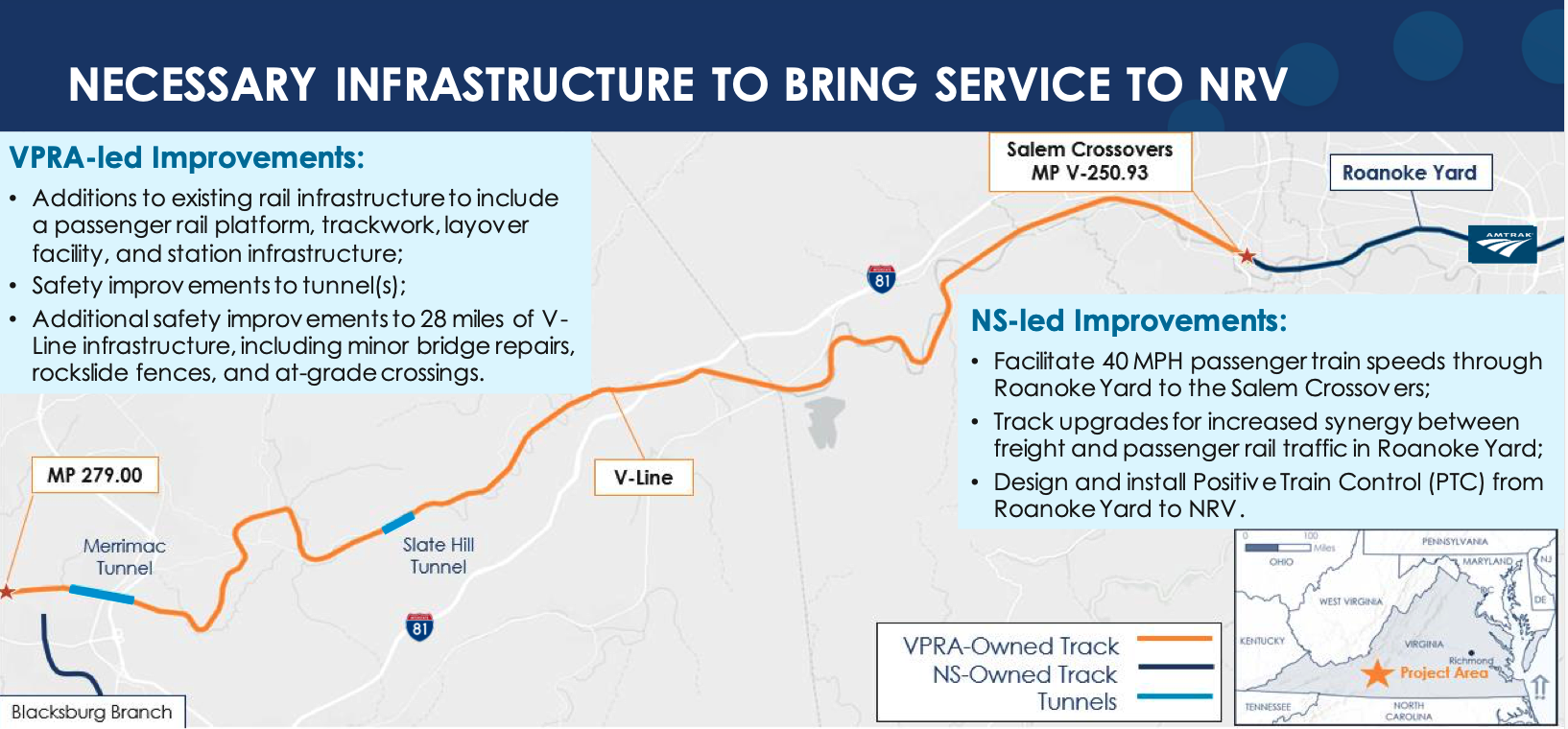 VPRA was established in 2020 to advance passenger and commuter rail in the commonwealth. In May 2021 it reached an agreement with NS to extend passenger service from Roanoke into the New River Valley. In 2022, the authority and NS finalized a deal that included a second Amtrak train on the Roanoke route, extension of service to the New River Valley, and the purchase of 28 miles of the former Virginian main line from Salem to Christiansburg. This year the authority has held public outreach on the proposed projects.