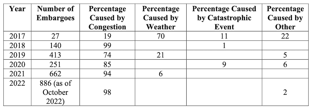 “The vast percentage of these embargoes, over 80%, are the result of what the railroads call congestion — a railroad euphemism for ‘we don’t have enough crews to move our trains and keep our network fluid,’” Oberman says.