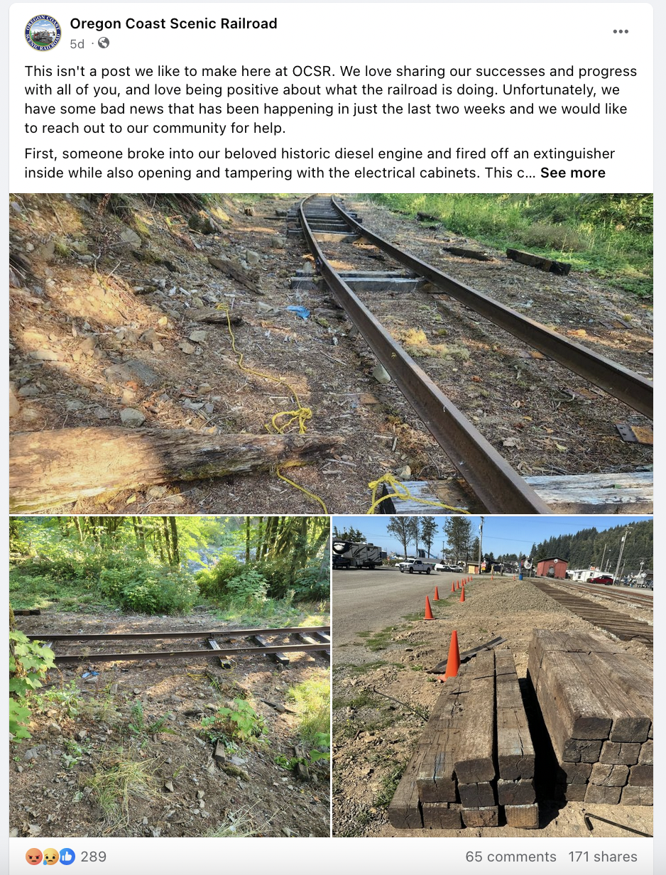 The railroad is asking that if anyone has more information about the thefts to contact the Tillamook Sheriff’s Office at (503) 842-2561. They can also contact the Oregon Coast Scenic Railroad via email at info@oregoncoastscenic.org.