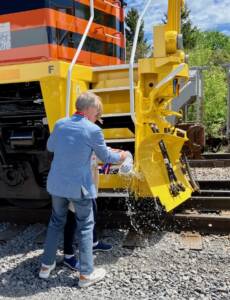 Mort Fuller and his wife, retired GWI communications director Sue Fuller, christened the 1899 by smashing a bottle of champagne on the locomotive’s pilot just before 1 p.m. The bubbly was still dripping off No. 1899 when steam whistle blasts echoed across the yard from a whistle once used on GNWR 2-6-0 No. 17.