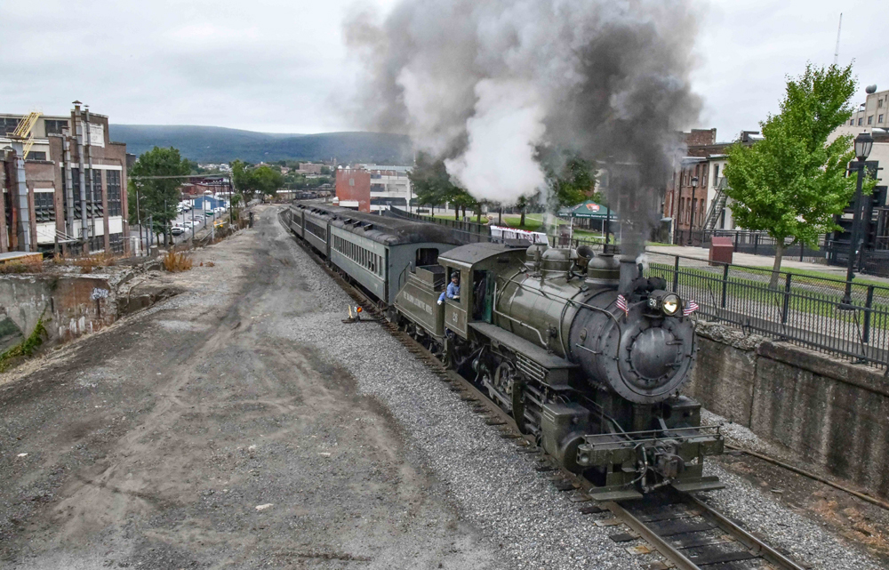 Pulled by Baldwin Locomotive Works 0-6-0 switcher No. 26 (BLW, 1929), the trains ran east past the former DL&W Scranton station, a six-story 1908 Beaux-Arts structure that has been repurposed and renovated as a Radisson hotel.
