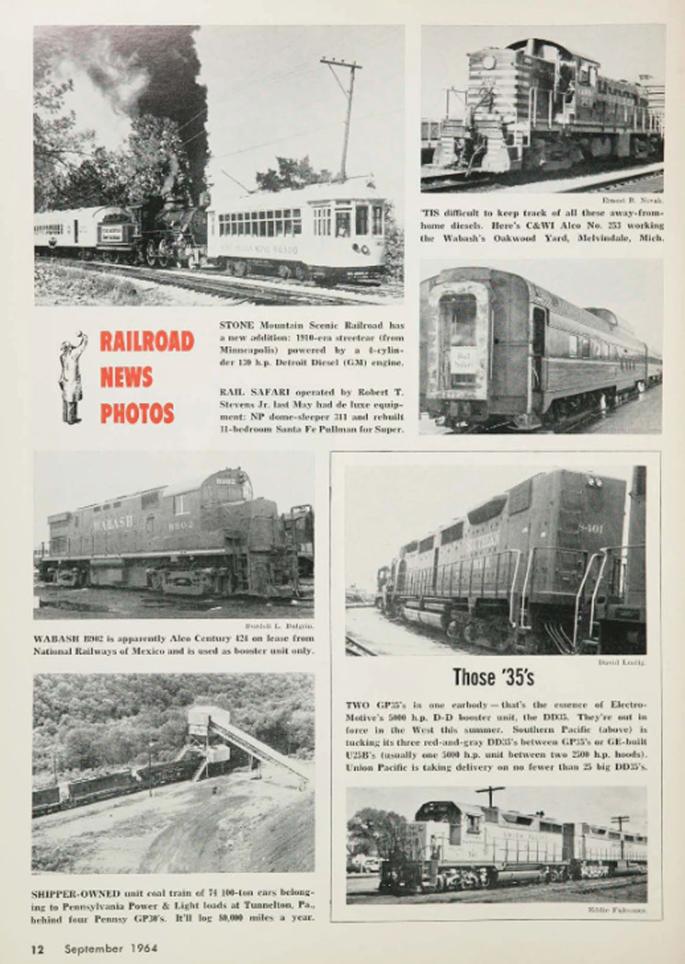 David Lustig: It was a photograph in the September 1964 issue of a new Southern Pacific EMD DD35 diesel in Los Angeles. I was 16 and armed with an Argus C3 camera. I took the picture, drove home, and developed and printed it. I was so excited when I took the photo that I didn’t frame it properly and my shot was crooked. I had it in the mail to Trains the next day.