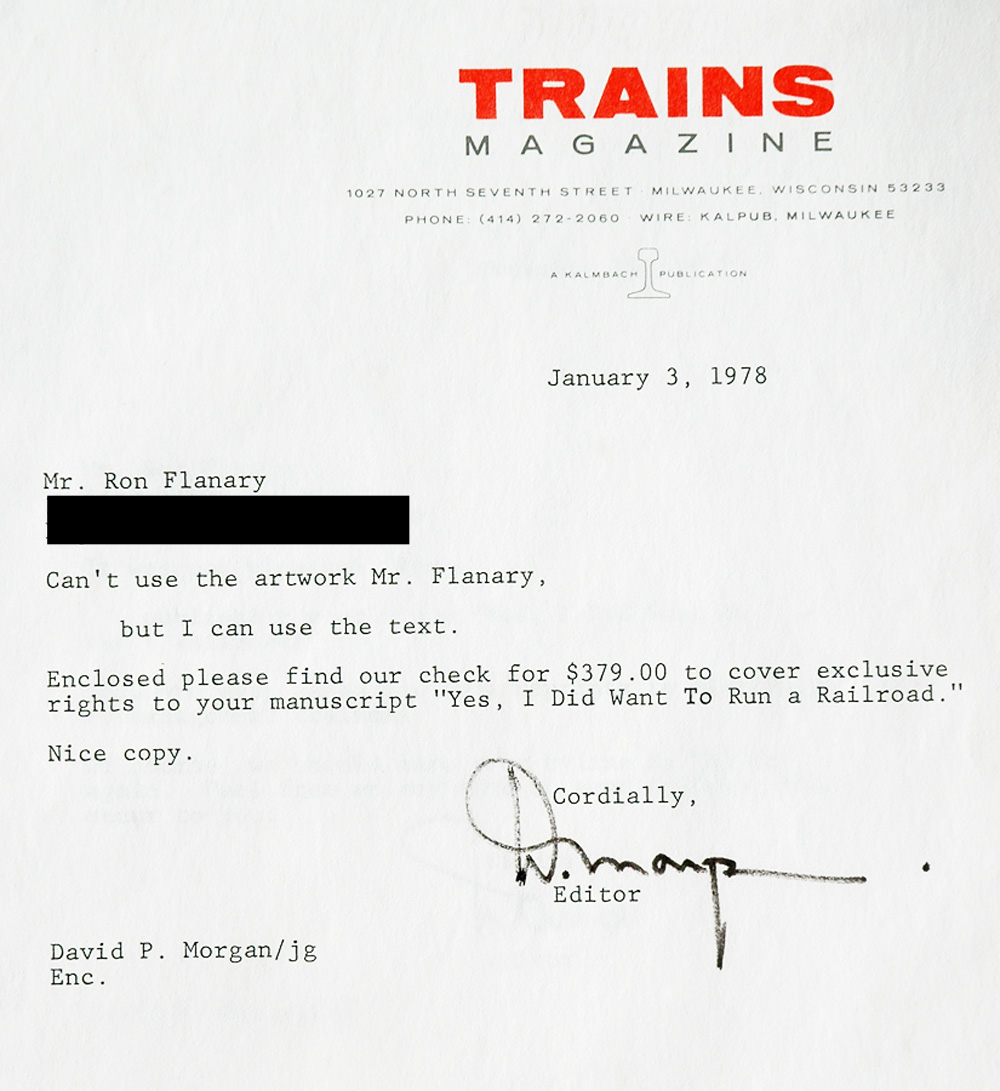 Within a few weeks, the postman delivered my return envelope, and of course I was crushed. However, when I opened it, there were the three drawings, a letter from my idol, Editor David P. Morgan, and a check for $375. Morgan’s letter (which I still have) said he couldn’t use the drawings, but the story was “nice copy.”