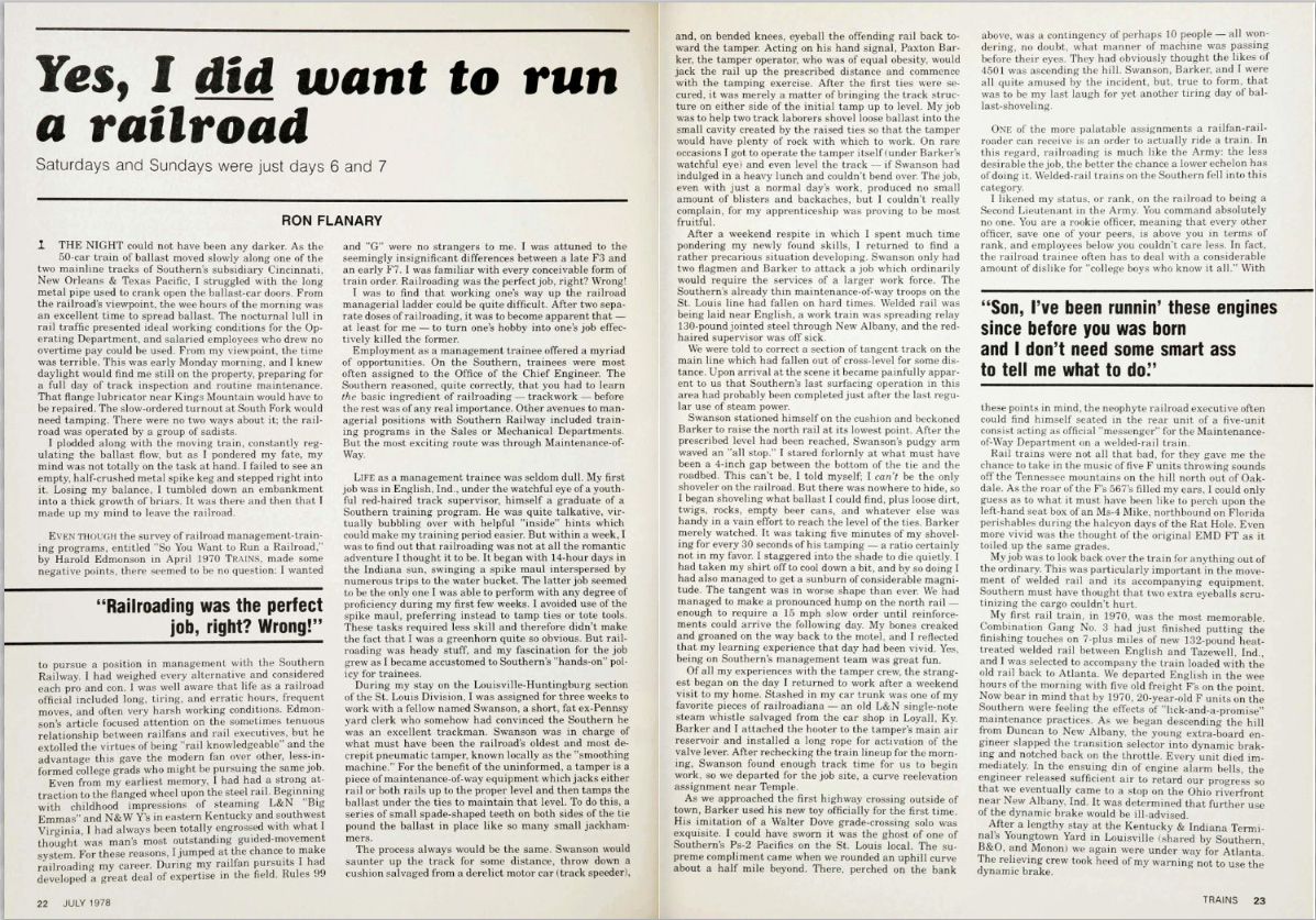 I think it was my first one in the July 1978. Southern Railway was so intrigued by my account of the work of a management trainee they sought permission from Kalmbach to reprint it and give to all prospective trainees going forward. Southern felt it was instructional to those applicants who were rail enthusiasts first but who might not be happy with such a work career in the long haul.