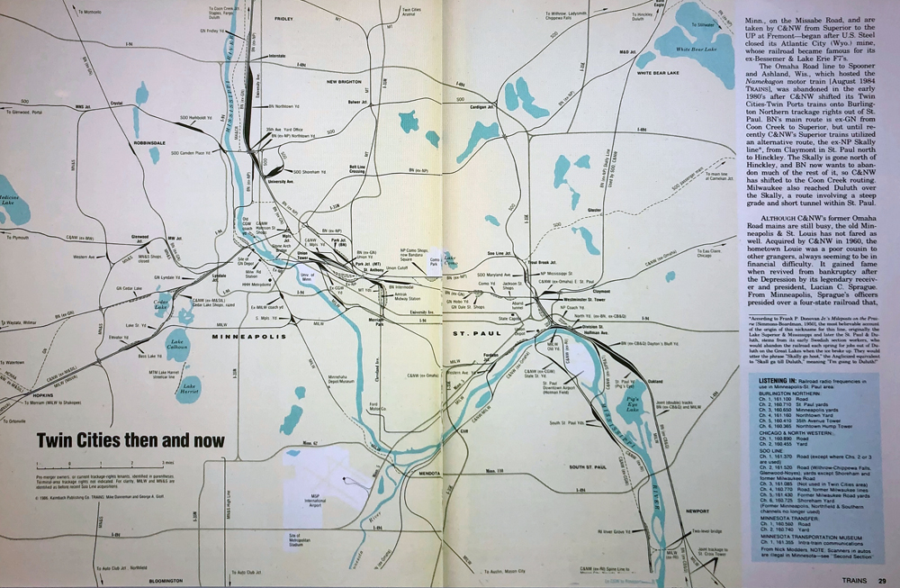 Steve Glischinski: I did a long article on railroads of the Twin Cities area in the October 1986 issue. It took a lot of time and research to do, plus Trains’ Art Department did a really great, detailed map. It got a lot of reaction, both good and bad. A lot of people liked it but some others thought it was too long and some people were unhappy with the photo selections. I just figured if it was getting all that reaction at least people were reading it! For many years I would see the map from that article all over the place – even in railroad offices where they photocopied it and stuck it up on the wall.