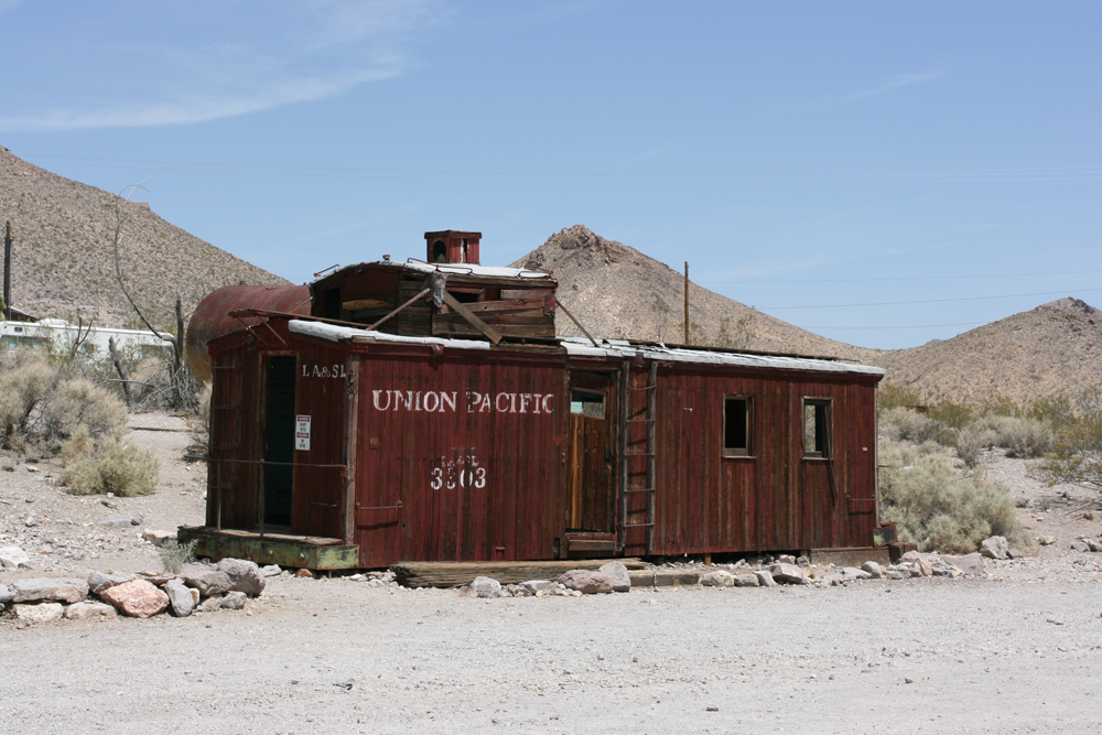 1. Rhyolite was served by the Las Vegas & Tonopah Railroad which connected in Las Vegas with the (San Pedro), Los Angeles & Salt Lake Railroad (LA&SL). The LA&SL was owned by the Union Pacific Railroad (UP), and UP still operates on that line. Consequently, it’s not surprising to find a UP caboose in Rhyolite. Rolling stock, then as now, often is shared or leased between railroads.