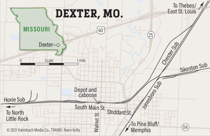 UP uses a directional traffic pattern on this corridor between Illinois and Arkansas. The former Missouri Pacific lines from Chicago and St. Louis funnel to the double-track Thebes Bridge on the Chester Subdivision, where the former Cotton Belt territory begins to Dexter. The Chester handles traffic in both directions into the north side of town. South of Dexter, the Jonesboro Sub handles southbound trains to Pine Bluff. Running west is the Hoxie Sub to North Little Rock, Ark., via Poplar Bluff, which handles primarily northbound trains. East of town lies what remains of the original Cairo, Arkansas & Texas to Bird’s Point, today called the Sikeston Sub. A trio of control points called Missouri Junction, Dexter Junction, and Charleston Junction channel the traffic between subdivisions. Both Missouri and Dexter Junction can be accessed down the hill off Crowley’s Ridge from Charleston Junction, and trains can use either routing to reach the crew change point.