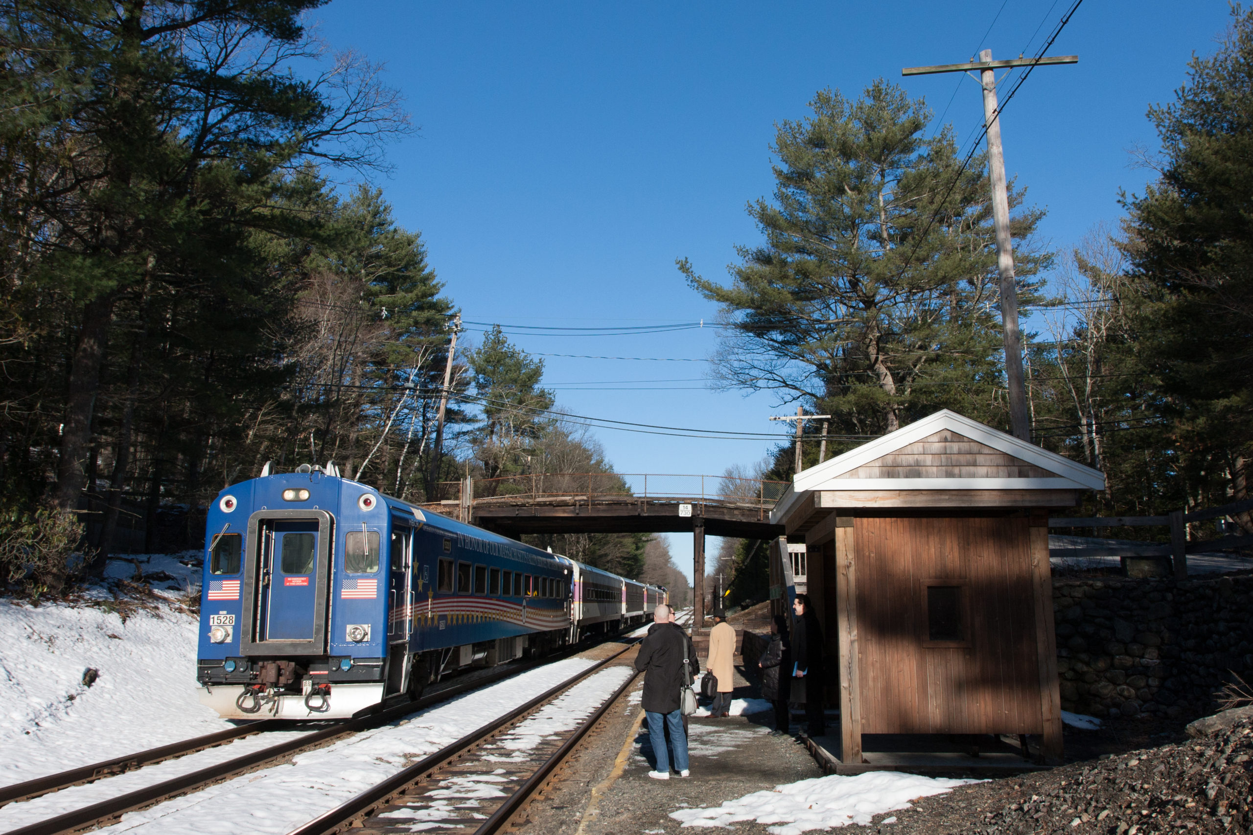 Boston-bound train 412 arrives at Silver Hill, led by cab car 1528 in special Gold Star livery, commemorating fallen soldiers of Massachusetts who fought in Iraq and Afghanistan.