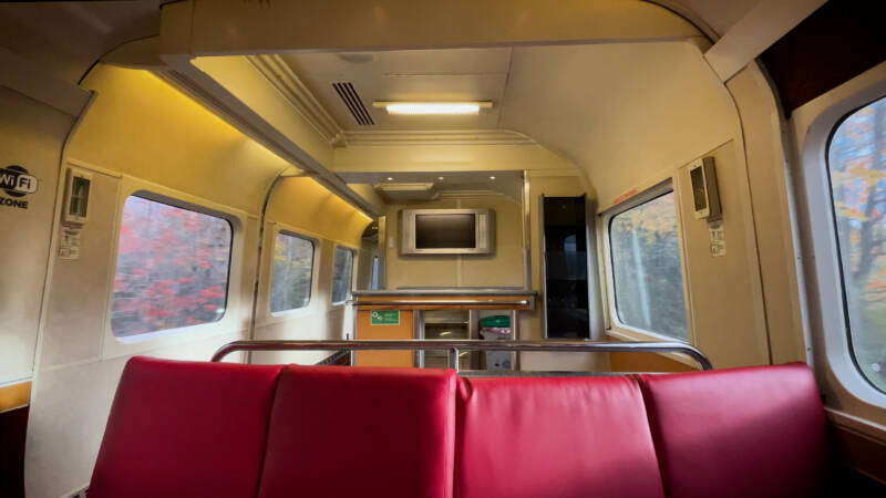 From my perspective, however, the two-tone teal exterior paint scheme appropriately ties the train name to its seaboard destination of Halifax, Nova Scotia. And even if the interior appointments slant towards sterile, they’re no less effective in framing the natural surroundings outside the large (compared to Amfleet coaches) picture window in each cabin.