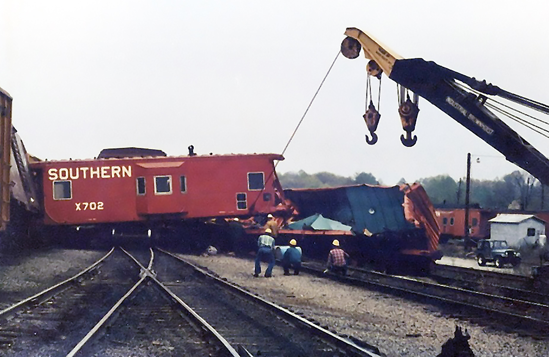 Caboose X702’s career on the Southern wasn’t always easy. In this photo in the 1970s, the car was derailed at the yard in Spencer, N.C. Photo courtesy of Matt Bumgarner