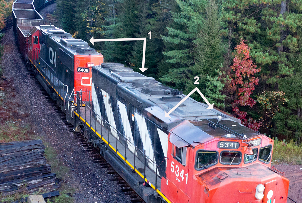 Winter affects locomotives: Both Canadian National locomotives pictured have winterization hatches (1) over the No. 1 radiator fans. While SD40-2 No. 5341 was purchased new by CN, No. 5408 is a former C&NW SD60 bought second hand by the railroad. The locomotive was part of a group of 55 SD60s acquired new by C&NW from EMD. They were all part of a canceled Soo Line order that specified winterization hatches. No. 5341 also has snow shields (2) over the central air intakes (just behind the cab) that feed fresh air into the carbody to cool various systems and for combustion by the prime mover. Chris Guss