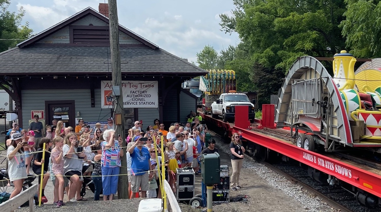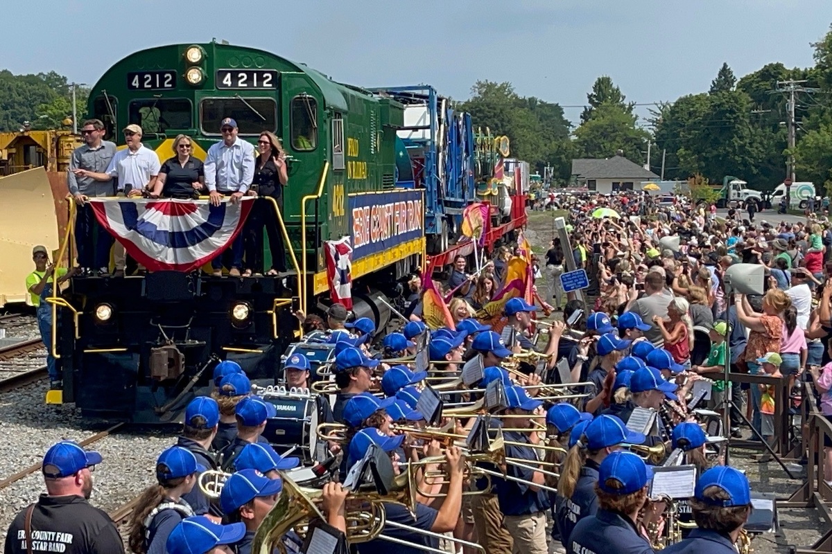 The nine-car train — which made its way from Strates headquarters in Taft, Fla., to Buffalo, N.Y., in CSX merchandise service last month — arrived to fanfare at the former Erie Railroad depot near the fairgrounds. A band played and a throng had gathered trackside to greet the train, which had not run since the end of the 2019 fair season.