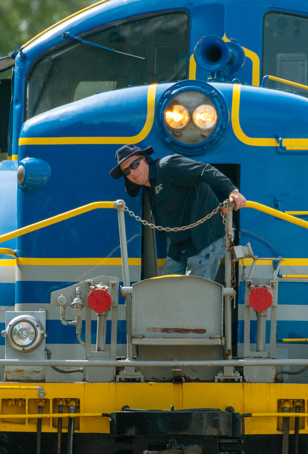 Railroad Photographer and Author John Eagan photographs mechanic Travis Hunt standing alongside Hoosier Valley Railroad BL2 No. 52 prior to the first of three debut runs to is backing out of North Judson, Ind., on its third and final debut run to English Lake, Ind., on Sept. 2, 2023.