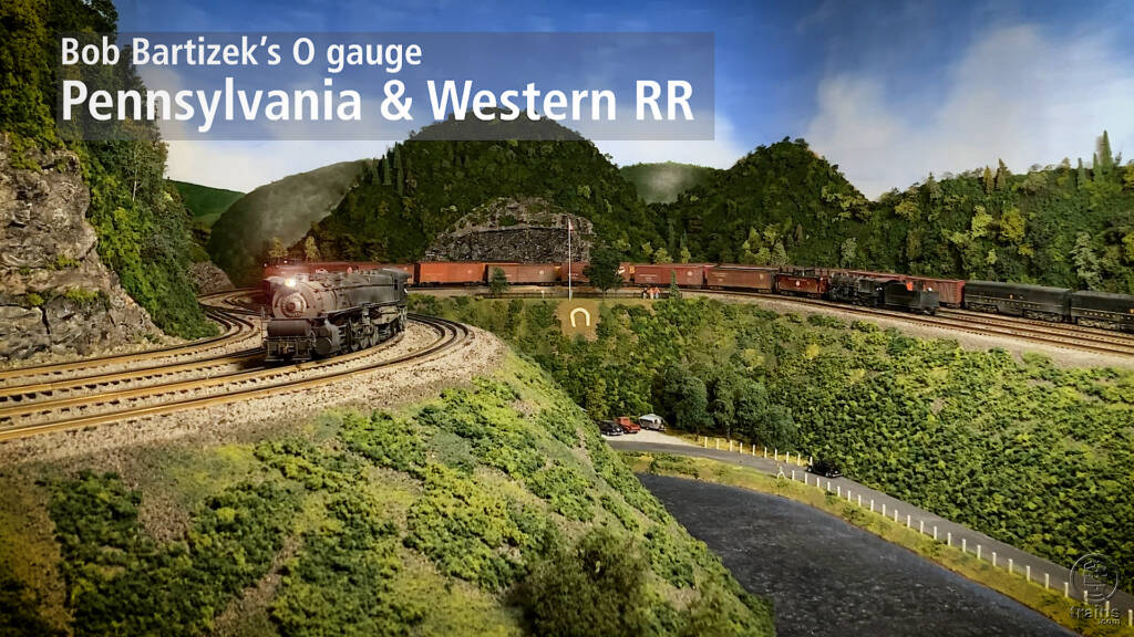 Tour the Pennsylvania & Western RR, Bob Bartizek’s impressive O scale (1:48, 3-rail) model railroad representing a fictional subdivision of the Pennsylvania RR in western Pennsylvania between 1949 and 1953. Though it uses 3-rail power and GarGraves Phantom-line O gauge track with a black center rail, the locomotives and rolling stock are all built to scale.