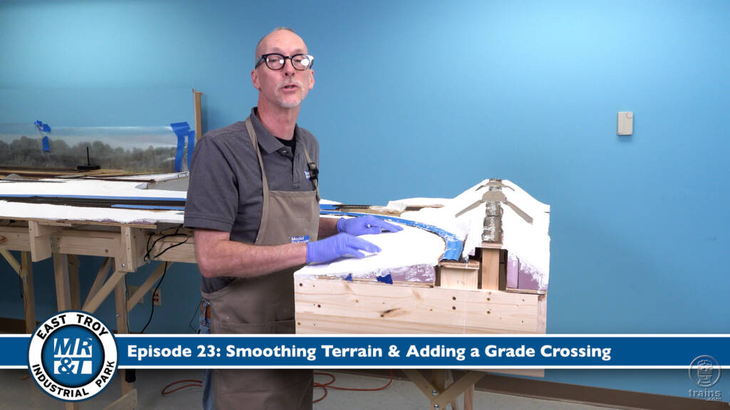 In this episode covering the HO scale (1:87.1) East Troy Industrial Park project layout, the construction crew dives into adding scenery and details. They first demonstrate techniques for shaping and smoothing scenes representative of rolling Wisconsin terrain. And then you’ll see the process for adding a grade crossing where the road meets the rails.